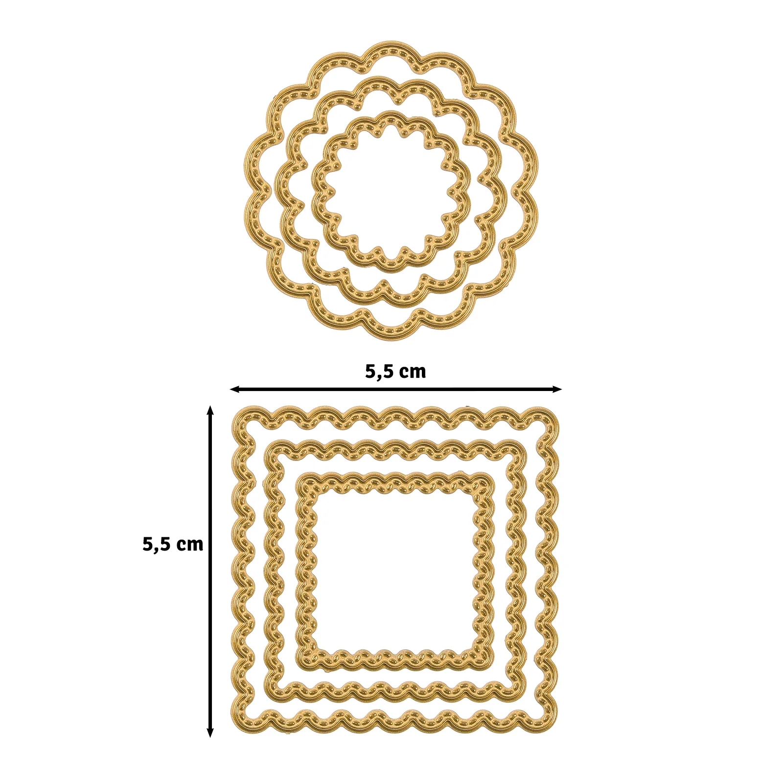Maße der Stanzen: 2,6 x 2,6 cm – 3,8 x 3,8 cm – 5 x 5 cm – 3,3 x 3,3 cm – 4,4 x 4,4 cm – 5,5 x 5,5 cm