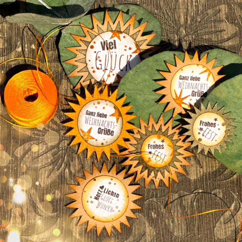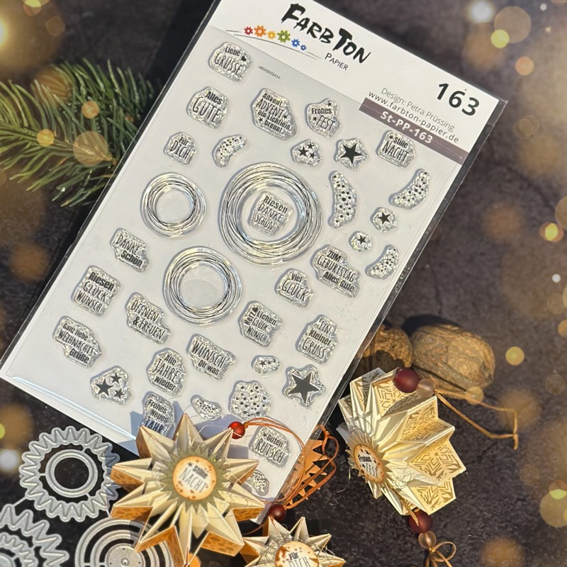 Das Stempelset 163 passt genau auf die Kreise des Stanzen-Sets 163 und hat neben weihnachtlichen Texten auch allgemeine Glückwünsche für das ganze Jahr.